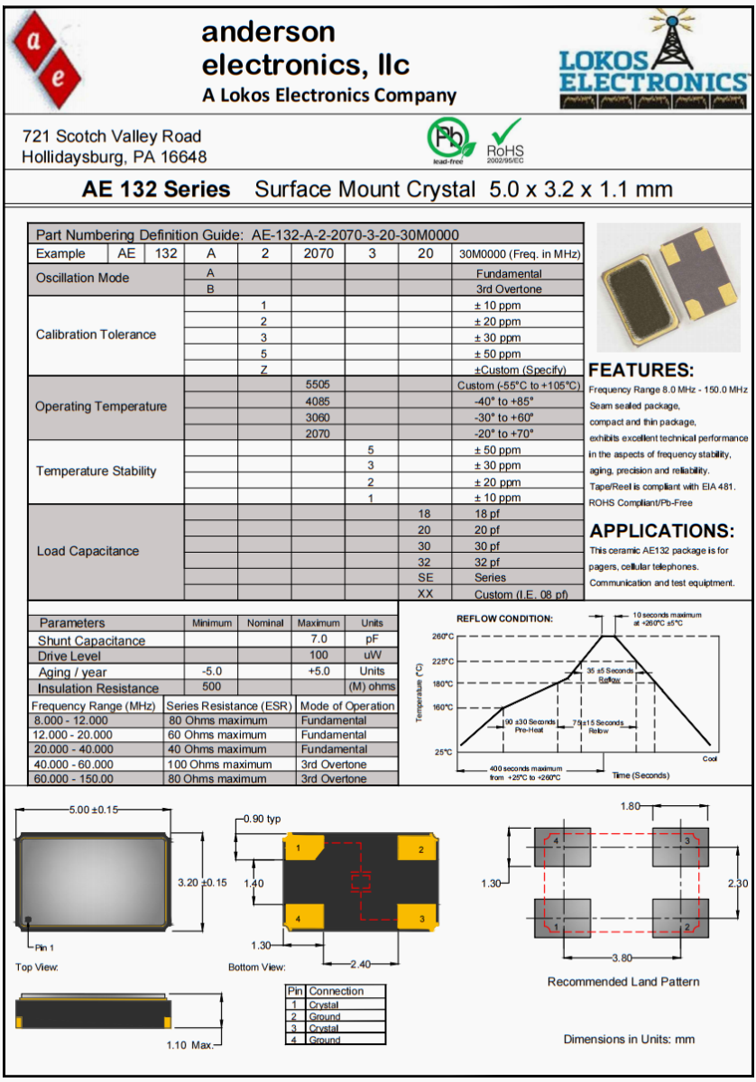 安德森進口無源晶振,AE132汽車大燈晶振,AE-132-A-2-2070-3-20-30M0000高品質(zhì)晶振,美國安德森晶振公司,Anderson晶振,AE-132晶振,無源晶振,貼片晶振,7050晶振,高精度晶振,高品質(zhì)晶振,美國晶振,進口晶振,低損耗晶振,高質(zhì)量晶振,通訊設(shè)備晶振,路由器晶振,石英晶振,產(chǎn)品具有高精度超小型的表面貼片型石英晶體振蕩器,最適用于移動通信終端的基準(zhǔn)時鐘等移動通信領(lǐng)域.比如智能手機,無線通信,衛(wèi)星導(dǎo)航,平臺基站等較高端的數(shù)碼產(chǎn)品,晶振本身小型,薄型具備各類移動通信的基準(zhǔn)時鐘源用頻率,貼片晶振具有優(yōu)良的電氣特性,耐環(huán)境性能適用于移動通信領(lǐng)域,滿足無鉛焊接的高溫回流溫度曲線要求,符合RoHS/無鉛。