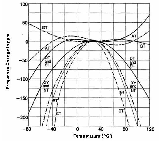 大部份的石英晶體產(chǎn)品是用于電子線路上的參考頻率基準(zhǔn)或頻率控制組件, 所以, 頻率與工作環(huán)境溫度的特性是一個(gè)很重要的參數(shù). 事實(shí)上, 良好的頻率與溫度(frequeny versus temperature)特性也是選用石英做為頻率組件的主要因素之一. 經(jīng)由適當(dāng)?shù)亩x及設(shè)計(jì), 石英晶體組件可以很容易的就滿足到以百萬(wàn)分之一 (parts per million, ppm) 單位等級(jí)的頻率誤差范圍. 若以離散電路方式將LCR零件組成高頻振蕩線路, 雖然也可以在小量生產(chǎn)規(guī)模達(dá)到所需要的參考頻率信號(hào)誤差在ppm或sub-ppm等級(jí)要求, 可是這種方式無(wú)法滿足產(chǎn)業(yè)要達(dá)到的量產(chǎn)規(guī)模. 石英組件的頻率對(duì)溫度特性更是離散振蕩線路無(wú)法簡(jiǎn)易達(dá)成的. 在(圖) 中提供了數(shù)種不同的石英晶體切割角度的頻率對(duì)溫度特性曲線.