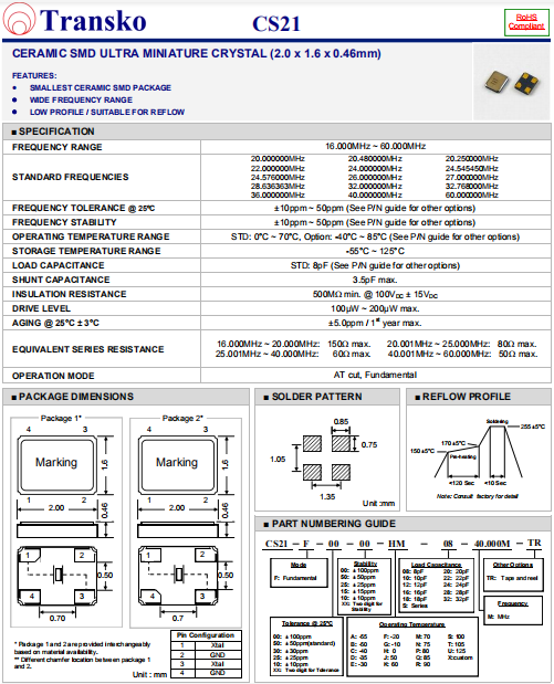 Transko晶振,CS21晶振,高性能石英晶體.貼片石英晶體,體積小,焊接可采用自動(dòng)貼片系統(tǒng),產(chǎn)品本身小型,表面貼片晶振,特別適用于有小型化要求的電子數(shù)碼產(chǎn)品市場(chǎng)領(lǐng)域,因產(chǎn)品小型,薄型優(yōu)勢(shì),耐環(huán)境特性,包括耐高溫,耐沖擊性等,在移動(dòng)通信領(lǐng)域得到了廣泛的應(yīng)用,晶振產(chǎn)品本身可發(fā)揮優(yōu)良的電氣特性,滿足無鉛焊接的高溫回流溫度曲線要求.