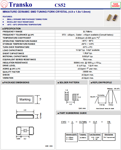 Transko晶振,CS52晶振,高品質石英晶體.小體積SMD時鐘晶體諧振器,是貼片晶振,千赫頻率元件,應用于時鐘模塊,智能手機,全球定位系統,因產品本身體積小,SMD編帶型,可應用于高性能自動貼片焊接,被廣泛應用到各種小巧的便攜式消費電子數碼時間產品,環保性能符合ROHS/無鉛標準.