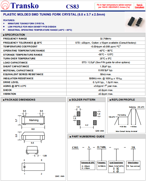 Transko晶振,CS83晶振,進口SMD晶體.32.768K時鐘晶體具有小型,薄型,輕型的貼片晶振表面音叉型晶體諧振器,產品具有優良的耐熱性,耐環境特性,可發揮晶振優良的電氣特性,符合RoHS規定,滿足無鉛焊接的高溫回流溫度曲線要求,金屬外殼的封裝使得產品在封裝時能發揮比陶瓷諧振器外殼更好的耐沖擊性.