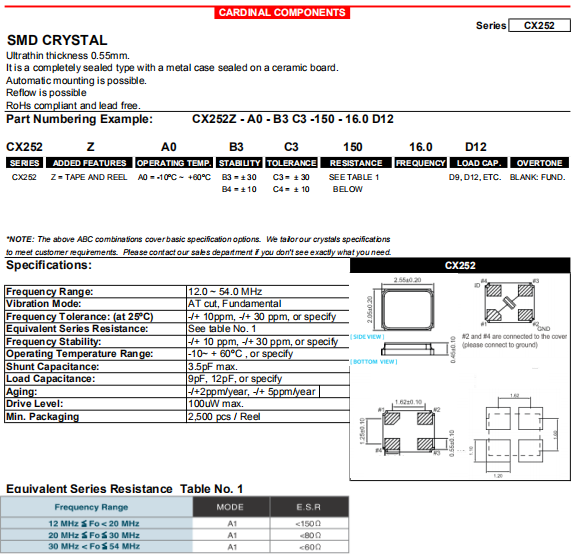 Cardinal晶振,CX252晶振,高品質諧振器.小體積貼片2520晶振,外觀小型,表面貼片型晶體諧振器,因本身體積小等優勢,適用于移動通信終端的基準時鐘等移動通信領域.小型,薄型,輕型 (2.5 × 2.0 × 0.5 mm typ.) 具備優良的耐環境特性及高耐熱性強.滿足無鉛焊接的回流溫度曲線要求.