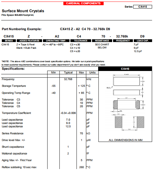 Cardinal晶振,CX415晶振,二腳貼片晶振.貼片表晶32.768K系列具有超小型,薄型,質(zhì)地輕的表面貼片音叉型石英晶體諧振器,晶振產(chǎn)品本身具備優(yōu)良的耐熱性,耐環(huán)境特性,在辦公自動化,家電領(lǐng)域,移動通信領(lǐng)域可發(fā)揮優(yōu)良的電氣特性,符合無鉛標準,滿足無鉛焊接的回流溫度曲線要求,金屬外殼的石英晶振使得產(chǎn)品在封裝時能發(fā)揮比陶瓷晶振外殼更好的耐沖擊性能.