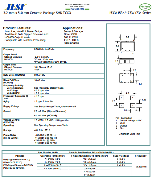 ILSI晶振,I733晶振,壓控溫補振蕩器.普通石英晶振,外觀完全使用金屬材料封裝的,產品本身采用全自動石英檢測儀,以及跌落,漏氣等苛刻實驗.產品本身具有高穩定性,高可靠性的石英晶體振蕩器,焊接方面支持表面貼裝,外觀采用金屬封裝,具有充分的密封性能,晶振本身能確保其高可靠性,采用編帶包裝,可對應產品應用到自動貼片機告訴安裝,滿足無鉛焊接的高溫回流溫度曲線要求.