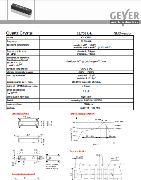 Geyer晶振,KX-327L晶振,環(huán)保石英晶體.貼片石英晶體,體積小,焊接可采用自動貼片系統(tǒng),產(chǎn)品本身小型,表面貼片晶振,特別適用于有小型化要求的電子數(shù)碼產(chǎn)品市場領(lǐng)域,因產(chǎn)品小型,薄型優(yōu)勢,耐環(huán)境特性,包括耐高溫,耐沖擊性等,在移動通信領(lǐng)域得到了廣泛的應(yīng)用,晶振產(chǎn)品本身可發(fā)揮優(yōu)良的電氣特性,滿足無鉛焊接的高溫回流溫度曲線要求.
