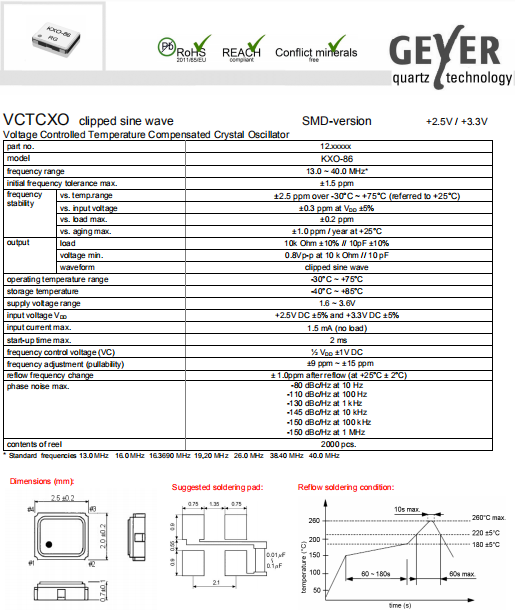 Geyer晶振,KXO-86晶振,VC-TCXO晶振.2520mm體積的石英晶體振蕩器,有源晶振,該產(chǎn)品可驅(qū)動2.5V的溫補晶振,壓控晶振,VC-TCXO晶體振蕩器產(chǎn)品,電源電壓的低電耗型,編帶包裝方式,可對應(yīng)自動高速貼片機自動焊接,及IR回流焊接(無鉛對應(yīng)),為無鉛產(chǎn)品,超小型,質(zhì)地輕.產(chǎn)品被廣泛應(yīng)用到集成電路,程控交換系統(tǒng),無線發(fā)射基站.
