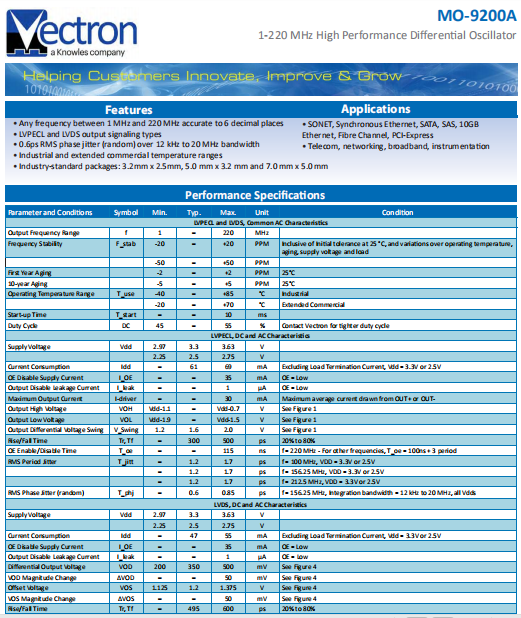VECTRON晶振,MO-9200A晶振,SPXO有源晶振.貼片式石英晶體振蕩器,低電壓啟動功率,并且有多種電壓供選擇,比如有1.8V,2.5V,3.3V,3.8V,5V等,產(chǎn)品被廣泛應(yīng)用于,平板筆記本,GPS系統(tǒng),光纖通道,千兆以太網(wǎng),串行ATA,串行連接SCSI,PCI-Express的SDH / SONET發(fā)射基站等領(lǐng)域.符合RoHS/無鉛.