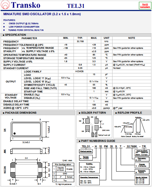 Transko晶振,TEL31晶振,時鐘晶體振蕩器.小體積SMD時鐘晶體振蕩器,是貼片音叉晶體,千赫頻率元件,應用于時鐘模塊,智能手機,全球定位系統,因產品本身體積小,SMD編帶型,可應用于高性能自動貼片焊接,被廣泛應用到各種小巧的便攜式消費電子數碼時間產品,環保性能符合ROHS/無鉛標準.