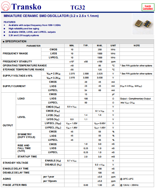 Transko晶振,TG32晶振,有源晶體振蕩器.貼片式石英晶體振蕩器,低電壓啟動功率,并且有多種電壓供選擇,比如有1.8V,2.5V,3.3V,3.8V,5V等,產(chǎn)品被廣泛應(yīng)用于,平板筆記本,GPS系統(tǒng),光纖通道,千兆以太網(wǎng),串行ATA,串行連接SCSI,PCI-Express的SDH / SONET發(fā)射基站等領(lǐng)域.符合RoHS/無鉛.