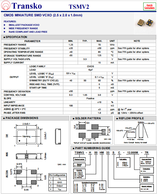 Transko晶振,TSMV2晶振,壓控晶體振蕩器.智能手機(jī)晶振,產(chǎn)品具有高精度超小型的表面貼片型石英晶體振蕩器,最適用于移動(dòng)通信終端的基準(zhǔn)時(shí)鐘等移動(dòng)通信領(lǐng)域.比如智能手機(jī),無(wú)線通信,衛(wèi)星導(dǎo)航,平臺(tái)基站等較高端的數(shù)碼產(chǎn)品,晶振本身小型,薄型具備各類移動(dòng)通信的基準(zhǔn)時(shí)鐘源用頻率,貼片晶振具有優(yōu)良的電氣特性,耐環(huán)境性能適用于移動(dòng)通信領(lǐng)域,滿足無(wú)鉛焊接的高溫回流溫度曲線要求.