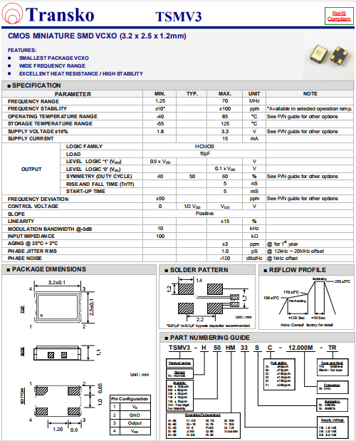 Transko晶振,TSMV3晶振,VCXO晶體振蕩器.普通石英晶振,外觀完全使用金屬材料封裝的,產(chǎn)品本身采用全自動石英檢測儀,以及跌落,漏氣等苛刻實驗.產(chǎn)品本身具有高穩(wěn)定性,高可靠性的石英晶體振蕩器,焊接方面支持表面貼裝,外觀采用金屬封裝,具有充分的密封性能,晶振本身能確保其高可靠性,采用編帶包裝,可對應(yīng)產(chǎn)品應(yīng)用到自動貼片機告訴安裝,滿足無鉛焊接的高溫回流溫度曲線要求.