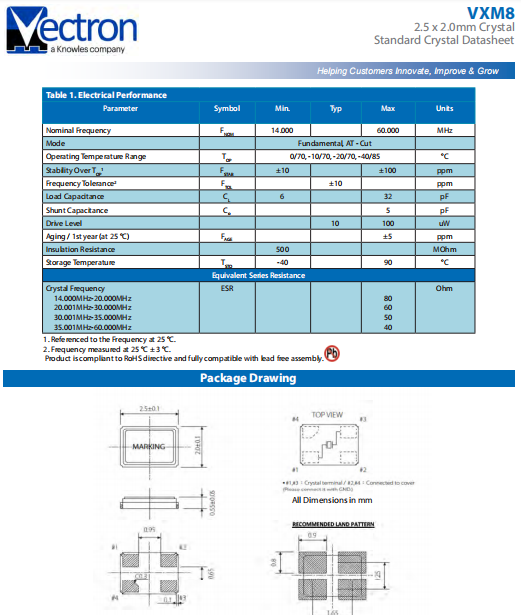 VECTRON晶振,VXM8晶振,無鉛環保晶體.普通貼片石英晶振外觀使用金屬材料封裝的,具有高穩定性,高可靠性的石英晶體諧振器,晶振外觀本身使用金屬封裝,充分的密封性能,可確保其高可靠性,采用編帶包裝,外包裝采用朔膠盤,可在自動貼片機上對應自動貼裝等優勢.