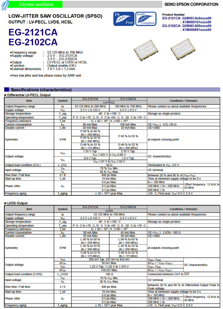 | X1M0002010008 | EG-2102CB | 100.000000 MHz | 5.00 x 3.20 x 1.40 mm | LV-PECL | 2.970 to 3.630 V |