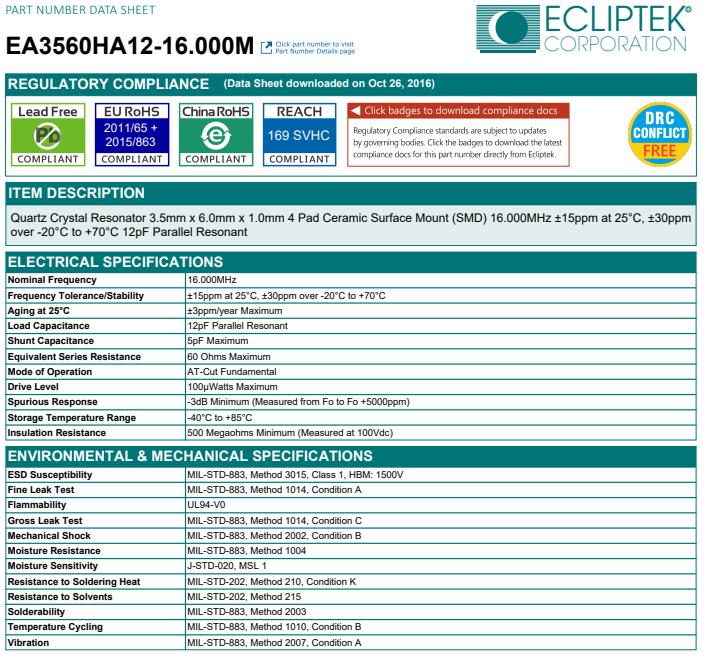 ECLIPTEK晶振將確保其振蕩器和石英晶體諧振器產品及相關設施滿足甚至超出國家的以及地方環保機構的相關法規規定及其他要求,同時該公司盡可能的參與并協助政府機關和其他官方組織從事的環保活動. 在地方對各項設施的管理責任中,確保滿足方針的目標指標,同時在各種經營與生產活動中完全遵守并符合現行所有標準規范的要求.ECLIPTEK晶振,EA3560HA12-16.000M晶振,6035mm貼片晶振 .