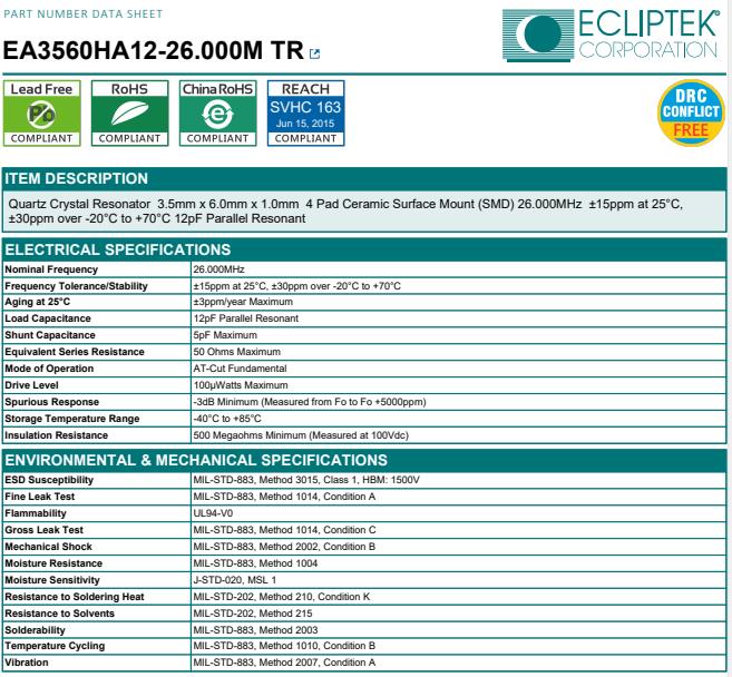 日蝕美國晶振,EA3560HA12-26.000M-TR無線通信晶振,6035mm無源晶體,我們的網站是為了幫助客戶確定黃華產品的RoHS和pb免費狀態。我們的RoHS/pbfree認證和IPC-1752材料聲明工具為我們的客戶提供了按零件編號處理他們的文檔請求的能力,并在幾秒鐘內收到一個全面的自動回復。