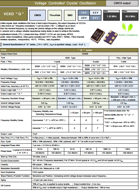 MERCURY晶振,瑪居禮壓控晶振,G576振蕩器.VCXO是指這款晶體產(chǎn)品控制功能只有單壓控也就是電壓控制功能,產(chǎn)品本身頻率精度可以隨著電壓搞定起伏來自動調(diào)整頻率,使產(chǎn)品永遠控制在一定的頻率范圍,壓控晶振(VCXO)壓控石英晶體振蕩器基本解決方案,PECL輸出,輸出頻率60 MHz到200 MHz之間,出色的低相位噪聲和抖動,三態(tài)功能,應用:SDH/ SONET,以太網(wǎng),基站,筆記本晶振應用, VCXO,壓控晶體應用:調(diào)制解調(diào)器,ADSL網(wǎng)絡控制器,無線基站,程控交換設備智能手機,筆記本晶振等.