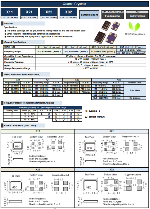 MERCURY晶振,瑪居禮貼片諧振器,X21晶體.小型表面貼片晶振型,是標準的石英晶體諧振器,適用于寬溫范圍的電子數碼產品,家電電器及MP3,MP4,播放器,單片機等領域,在電子數碼產品,以及家電相關電器領域里面發揮優良的電氣特性,滿足無鉛焊接的回流溫度曲線要求.