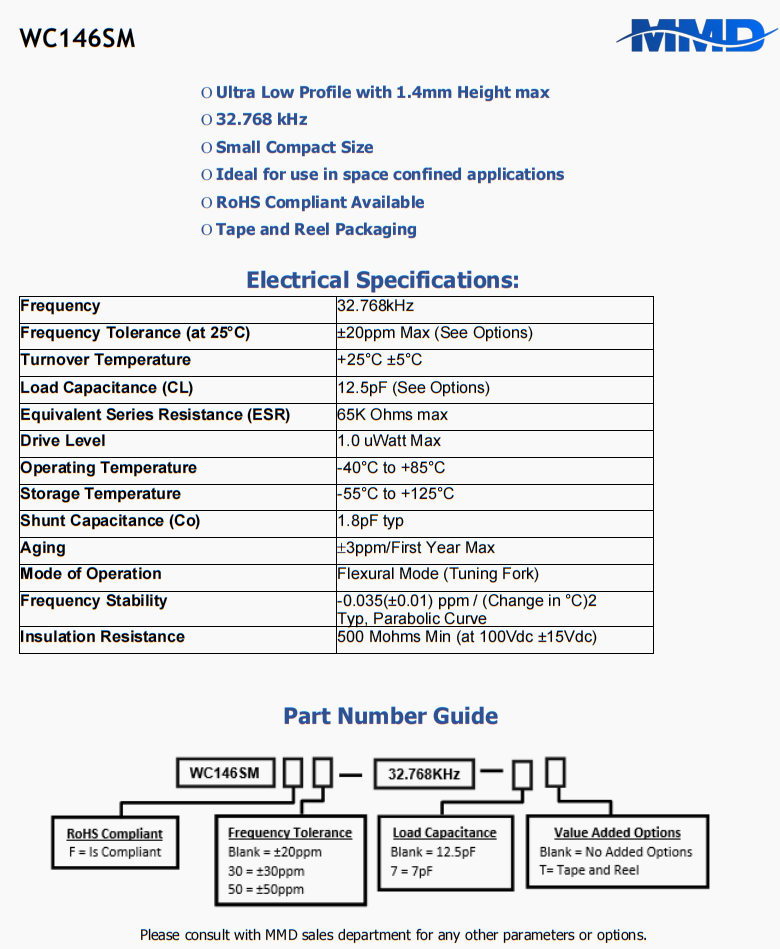 | WC146SMF-32.768KHZ-T | MMD | WC146SM | -40°C ~ 85°C | 32.768 kHz | ±20ppm | 12.5 pF | |
