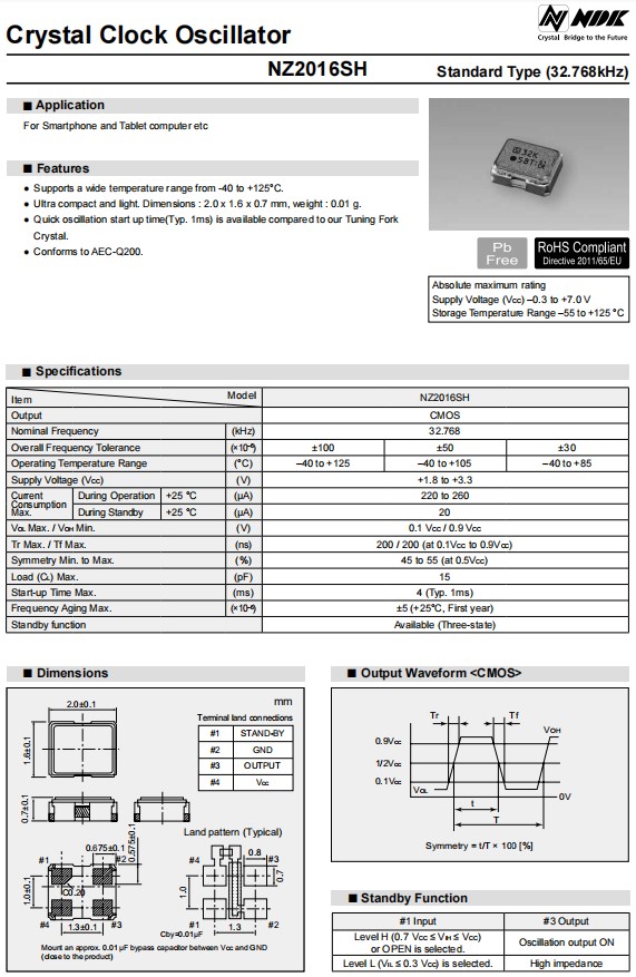 NZ2016SH-24.000MHZNSC5022C平板電腦晶振,NDK晶體振蕩器,日本NDK晶振,進(jìn)口晶振,NZ2016SH型號(hào)是一款小體積晶振尺寸2.0x1.6x0.7mm四腳貼片晶振,32.768KHz晶振,石英晶體振蕩器,有源晶振,無鉛環(huán)保晶振,支持寬溫度范圍從-40°C到+125°C,超緊湊和輕,重量:0.01g,快速振蕩啟動(dòng)時(shí)間(類型,1ms)是可用的相比,符合AEC-Q200,電源電壓(VCC)-0.3至+7.0 V,石英晶體振蕩器具有超小型,輕薄型,耐熱及耐環(huán)境特點(diǎn),適用于智能手機(jī),平板電腦,鐘表電子,無線網(wǎng)絡(luò),藍(lán)牙模塊,可穿戴設(shè)備,汽車電子,醫(yī)療設(shè)備,物聯(lián)網(wǎng)應(yīng)用等