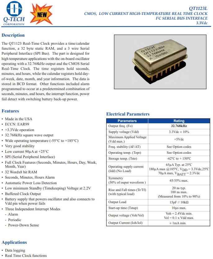 QT1123L88M-32.768kHz,實時時鐘應(yīng)用晶振,32.768KHz進口晶振,Q-Tech晶振,QT1123L實時時鐘模塊,QT1123L88M-32.768kHz晶振,石英晶體,該器件設(shè)計用于板載振蕩器的高溫應(yīng)用,采用32.768kHz輸出和CMOS串行實時時鐘,時間寄存器保存秒,分鐘和小時,而日歷寄存器保存星期、日期、月份和年份信息,數(shù)據(jù)是以BCD格式存儲,其他功能包括報警,被編程為在以下預(yù)定組合下發(fā)生 秒、分、小時、中斷功能、功率 通過切換電池備用電源進行故障檢測,實時時鐘應(yīng)用晶振,數(shù)據(jù)記錄晶振.