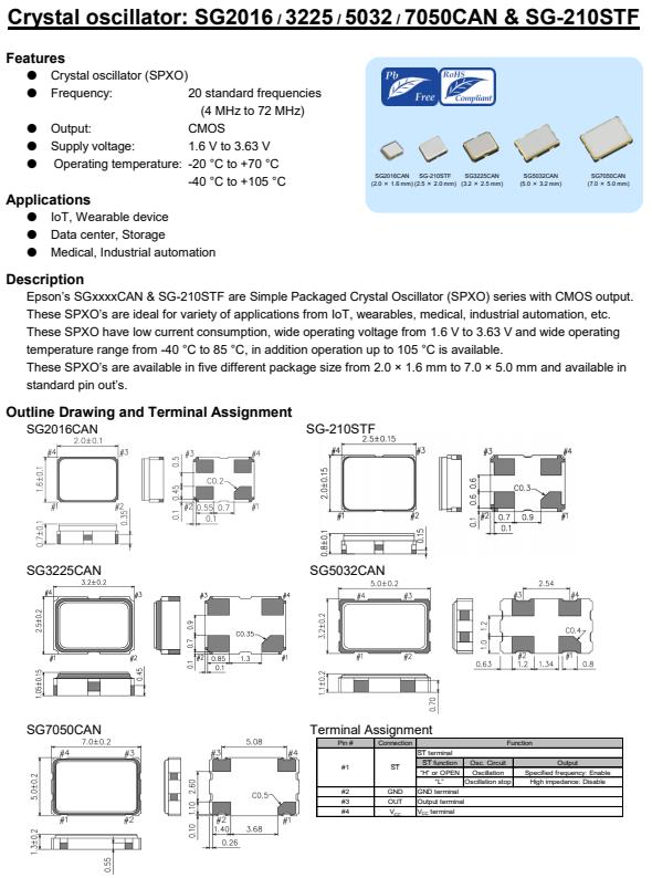 愛普生的SGxxxxCAN和SG-210STF是具有CMOS輸出的簡單封裝晶體振蕩器(SPXO)系列。這些SPXO是物聯網、可穿戴設備、醫療、工業自動化等各種應用的理想選擇。這些SPXO有源晶振具有低電流消耗,寬工作電壓從1.6 V到3.63 V,寬工作溫度范圍從-40°C到85°C,另外可操作到105°C。這些SPXO的可在五種不同的包裝尺寸從2.0 × 1.6毫米到7.0 × 5.0毫米,可在標準針的。