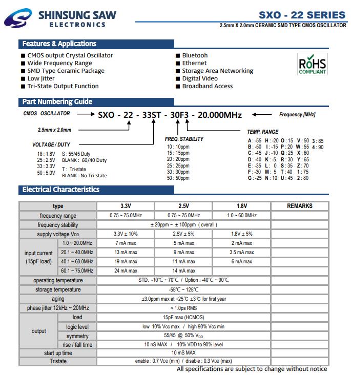 韓國新松晶振,SXO-22晶體振蕩器,SXO-22-15ST-30F3-20.000MHz晶振,有源晶振,是指晶體本身起振需要外部電壓供應,起振后可直接驅(qū)動CMOS集成電路,產(chǎn)品本身已實現(xiàn)與薄型IC(TSSOP封裝,TVSOP封裝)同樣的1mm厚度,斷開時的消費電流是15µA以下,編帶包裝方式可對應自動搭載及IR回流焊接(無鉛對應)產(chǎn)品有幾種電壓供選1.8V,2.5V,3V3.3V,5V,以應對不同IC產(chǎn)品需要.