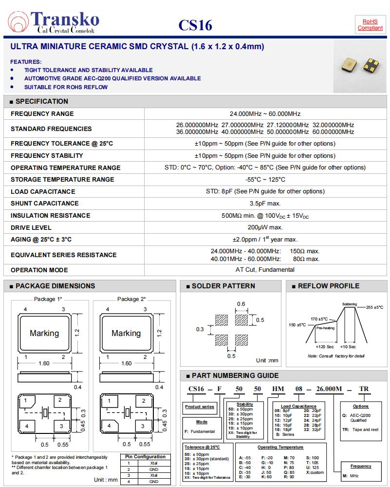 特蘭斯科晶振,CS16-F3030CU08-48.000M-TR,車載遙控器晶振參數表