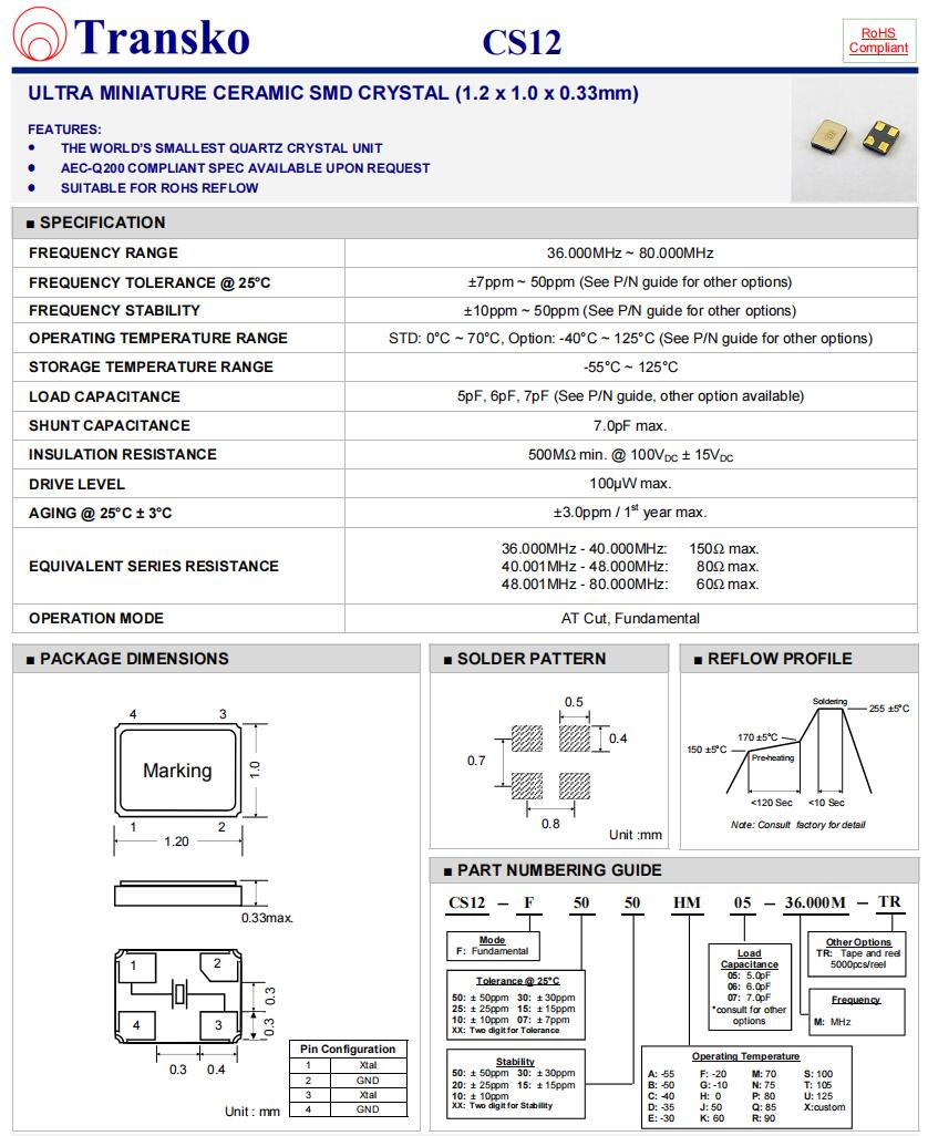 Transko晶振,CS12-F1020CQ06-20.000M-TR,6G無線應(yīng)用晶振參數(shù)表