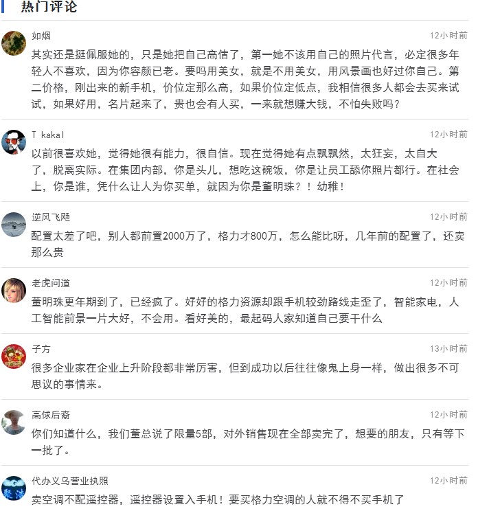 根據(jù)格力官方銷售平臺顯示,目前只賣出5臺,這款手機據(jù)說是董明珠親自代言做廣告,手機開機畫面即為董明珠本人,希望能讓國人愛上中國制造。這銷量可真是震驚了整個手機界。之前董明珠大膽放言:“華為賣老大,我就賣老二嘛。”但是,理想很美好,現(xiàn)實卻很殘酷。董明珠的豪言與現(xiàn)在目前銷量上很不符合,由此,各種聲音此起彼伏“董大媽對于這你真不怕被打臉么?”借助網(wǎng)友的話,"那個開機畫面,實在是看著心累,董大媽太搶鏡。""建議董大媽不要再折騰做手機了,好好做格力空調吧,把空調質量再進一步的完美"等等之類的話,可讓網(wǎng)友們操碎了心,我們來看看網(wǎng)友的一些評論,此評論來源由騰訊網(wǎng):