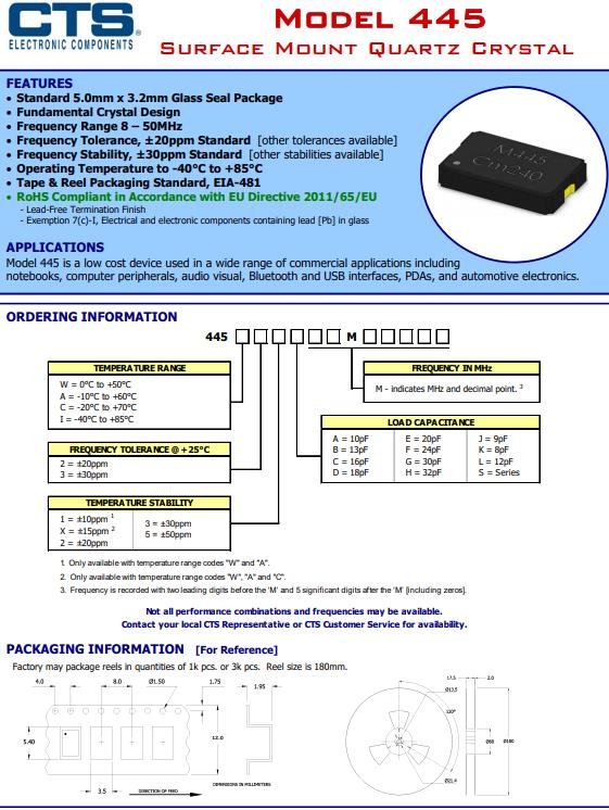 編碼445A35L24M00000,標準5.0mm × 3.2mm玻璃密封封裝,“基本無源晶體設計”,頻率范圍8 - 50MHz,頻率公差,±20ppm標準[其他公差可用],頻率穩定性,±30ppm標準[可提供其他穩定性],工作溫度:-40℃~ +85℃,卷帶包裝標準,EIA-481,符合歐盟指令2011/65/EU的RoHS要求,-無鉛終止處理,豁免7(c)- i,玻璃中含有鉛[Pb]的電氣和電子元件.