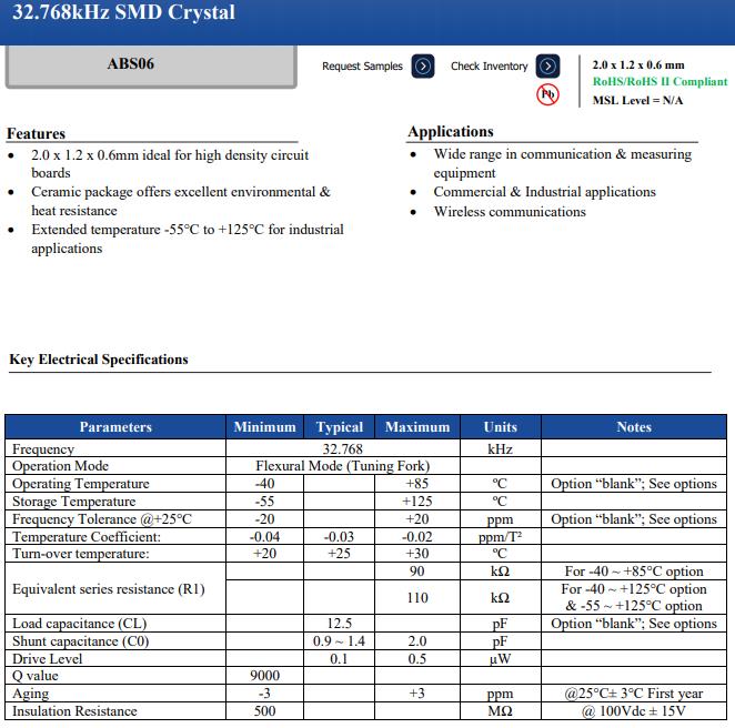| ABS06-32.768KHZ-T | Abracon晶振 | ABS06 | kHz Crystal (Tuning Fork) | 32.768kHz | 2-SMD, No Lead |