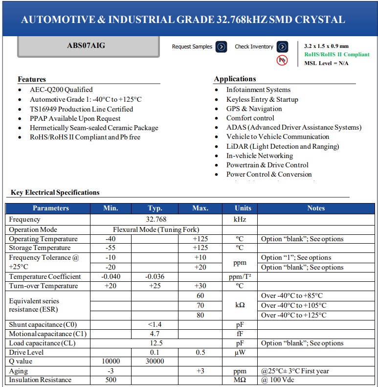 | ABS07L-32.768KHZ-T | Abracon晶振 | ABS07L | kHz Crystal (Tuning Fork) | 32.768kHz |