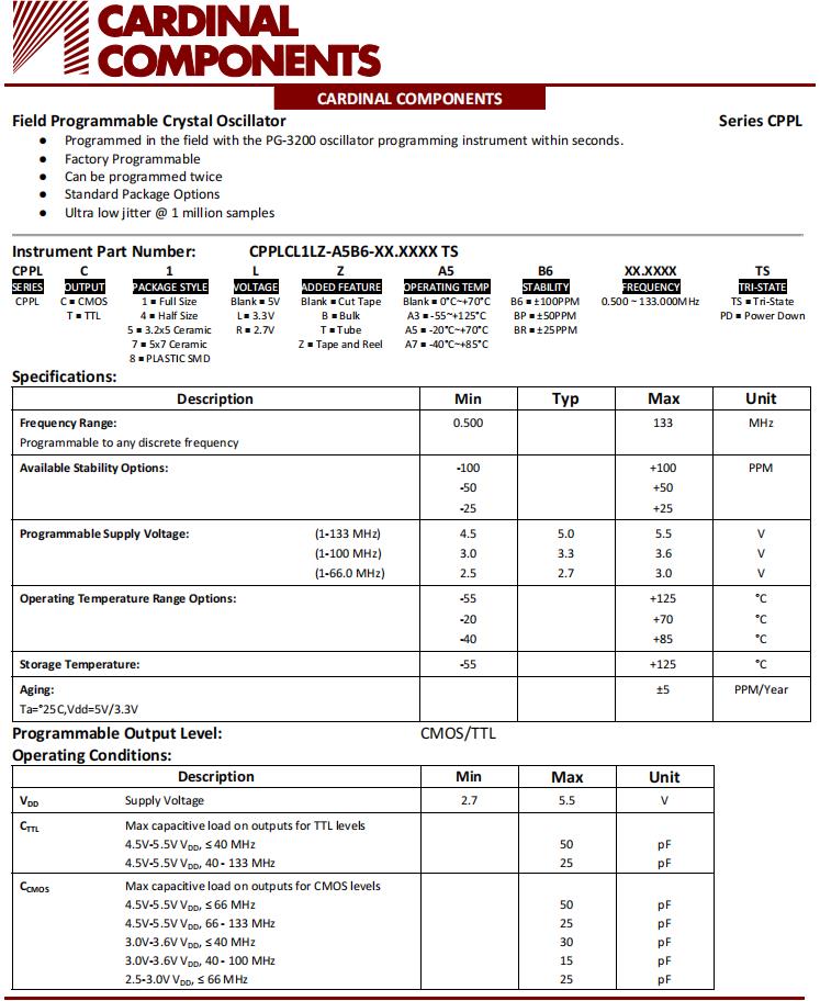 Cardinal低抖動(dòng)的XO振蕩器編碼CPPLC5-A7BR-25.0TS常用于高速通信和基站,SPXO振蕩器產(chǎn)品特點(diǎn):