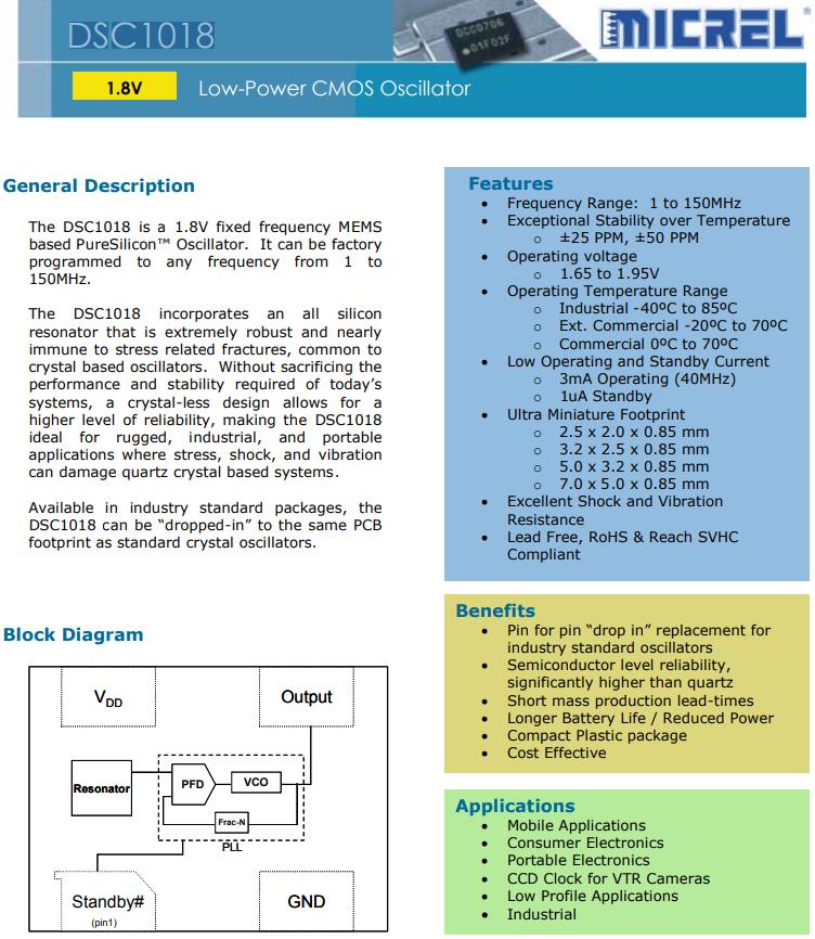 更多>>Microchip晶振編碼DSC1018DE1-125.0000T是一款CMOS輸出的OSC振蕩器,用于便攜式電子
