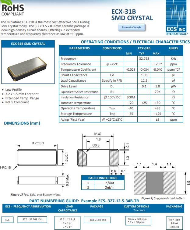 編碼ECS-.327-12.5-34B-TR是一款低姿態,3.2 × 1.5 mm占地面積,擴展溫度范圍,通過無鉛認證,參數條件ecx-31b單元最小TYP最大