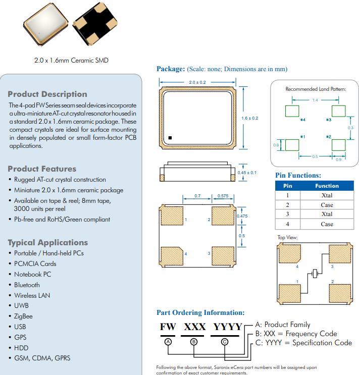 | FW1600008 | Diodes晶振 | SaRonix-eCera™ FW | MHz Crystal | 16MHz | ±20ppm |