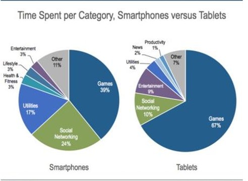 無論在平板電腦還是智能手機(jī)平臺上,游戲都是使用最多的應(yīng)用,在平板電腦中占67%,在智能手機(jī)中占39%。不過這進(jìn)一步證明,平板電腦是一種“媒體工具”。消費(fèi)者在平板電腦上玩游戲的頻率比智能手機(jī)上多71%。