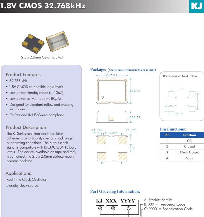 KJ系列實時時鐘晶體振蕩器在廣泛的范圍內實現卓越的穩定性的操作條件。輸出時鐘信號兼容LVCMOS/LVTTL邏輯的水平。該設備可在磁帶和卷軸上使用,包含在2.5 x 2.0mm的表面安裝陶瓷包裝。