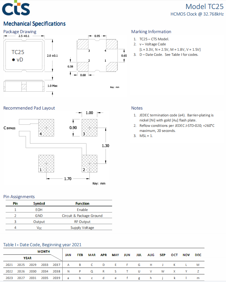 | TC25V3A32K7680 | CTS晶振 | TC25 | 32.768kHz | ±50ppm | 4-SMD, No Lead |
