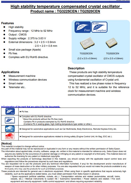 | X1G005161002227 | TG2520CEN | 12.288000MHz | 2.50x2.00x0.80mm | CMOS | 2.375 to 3.630 V |