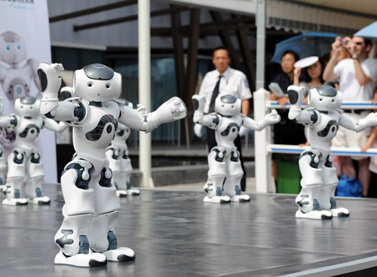 上海世博會迎來法國館國家館日活動。在法國館外,20個憨態可掬的機器人“腦”和著音樂的節拍,為觀眾帶來精彩的集體舞表演,吸引了眾多觀眾觀看。據介紹,身高58厘米的機器人“腦”,跳舞、爵士樂、足球樣樣精通,還通曉20多個國家的語言,被一些觀眾稱為“小天才”。