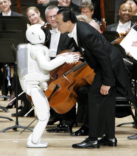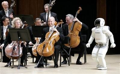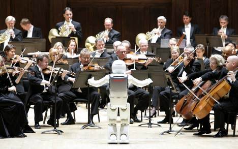 機器人現場指揮交響樂 點頭鞠躬無所不能,在一片暗淡光線的籠罩下,坐無缺席的音樂大廳逐漸安靜下來,指揮家像模像樣地走了出來,站在觀眾面前的是一個全身閃著亮光的白顏色機器人,高4英尺三英寸。這個非同尋常的機器人名為ASIMO,它于本周二晚接受了一次嚴峻挑戰:現場指揮底特律交響樂團,樂團演奏的是百老匯音樂劇《夢幻騎士》中的精彩曲目《不可能的夢想》。ASIMO以小孩子的口吻對觀眾說:“大家好”,隨后向樂隊擺手,示意演出開始。