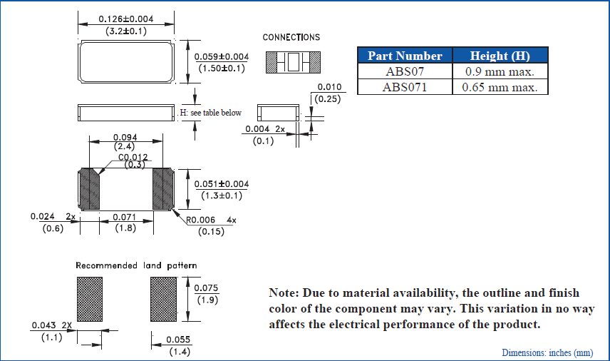 | ABS07-32.768KHZ-T | Abracon LLC | ABS07 | kHz Crystal | 32.768kHz | 2-SMD, No Lead | 0.126" L x 0.061" W (3.20mm x 1.50mm) | 0.035" (0.90mm) |