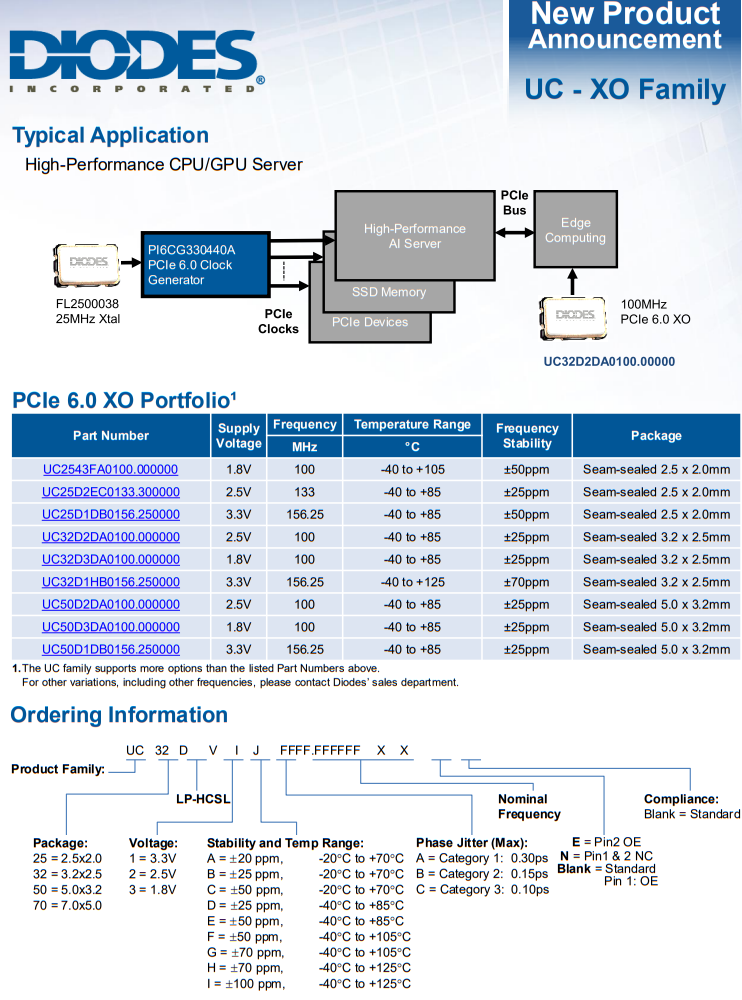 DIODES公司UC型號(hào)石英晶體振蕩器的超低抖動(dòng)使其成為網(wǎng)絡(luò)和計(jì)算應(yīng)用中PCIe 6.0時(shí)鐘的理想選擇。PCIe 6.0標(biāo)準(zhǔn)100MHz頻率,可選25~161MHz頻率范圍,靈活的頻率選擇支持各種系統(tǒng)設(shè)計(jì)要求,低15mA電流,支持1.8V, 2.5V, 3.3V供電電壓,標(biāo)準(zhǔn)HCSL器件的一半供電電流,超低<100fsRMS的抖動(dòng),片上終端無需外接電阻,節(jié)省電路板空間,降低成本。 特征,超低相位抖動(dòng),最大有效值0.1ps。(12kHz至20MHz),溫度范圍擴(kuò)展至125℃,完全無鉛和完全符合RoHS標(biāo)準(zhǔn),無鹵素和銻。“綠色”產(chǎn)品,在單獨(dú)的數(shù)據(jù)表(UCQ系列)下提供符合汽車標(biāo)準(zhǔn)的部件。應(yīng)用程序,網(wǎng)絡(luò)系統(tǒng),光學(xué)模塊,服務(wù)器和存儲(chǔ)系統(tǒng),專業(yè)視頻設(shè)備,測試與測量,F(xiàn)PGA/ASIC時(shí)鐘生成,112 g系列應(yīng)用程序。